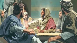 Jésus en route, ses disciples, Marthe, Marie, des amis, Lazare.